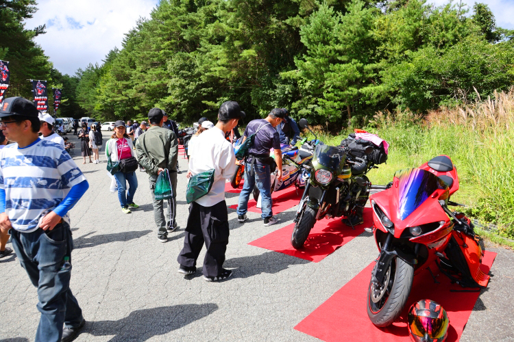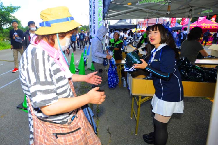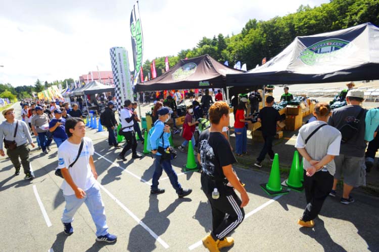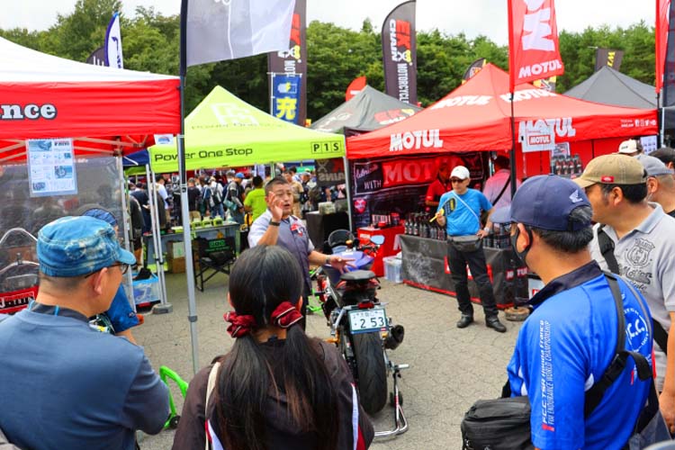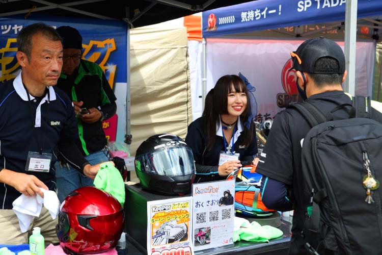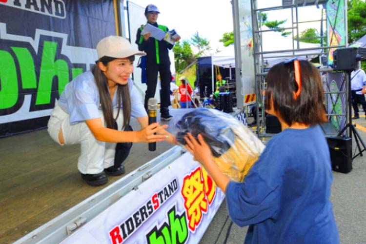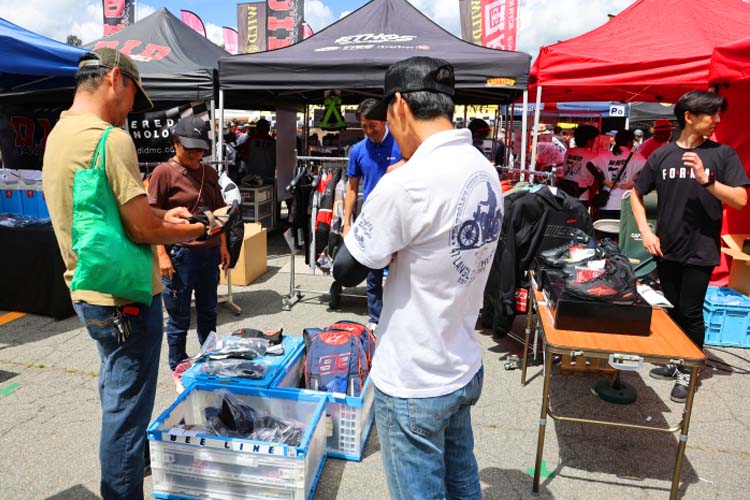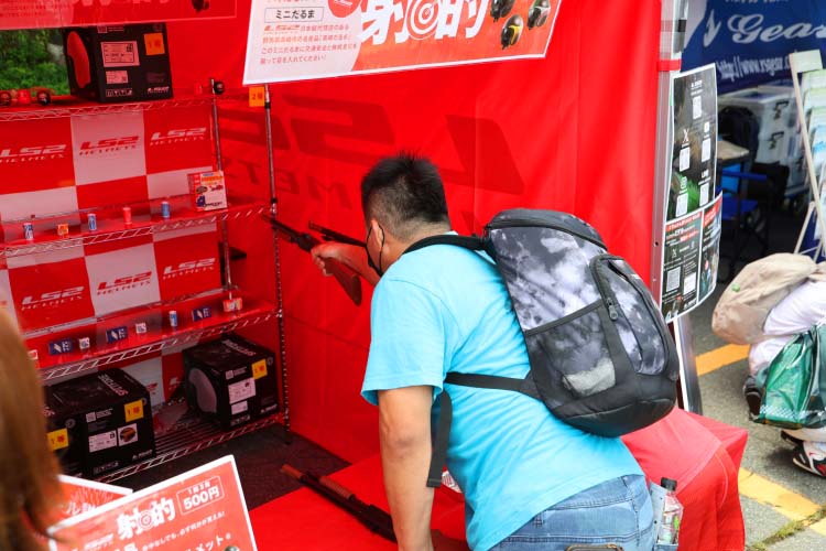 各ブースが趣向を凝らしてブース運営をしています。前述の通りに「お祭り価格」のアウトレットブース、抽選や射的などで景品をゲットできるブース、商品の実演をしてくれるブース、ヘルメットメンテナンスなどなど。マフラーメーカーさんは展示車両でサウンドを聴かせてくれました。細かく書くと本当に多種多様なのですが、それらをひとつずつ楽しむのも「特別な場所」(参加者)となるのです。