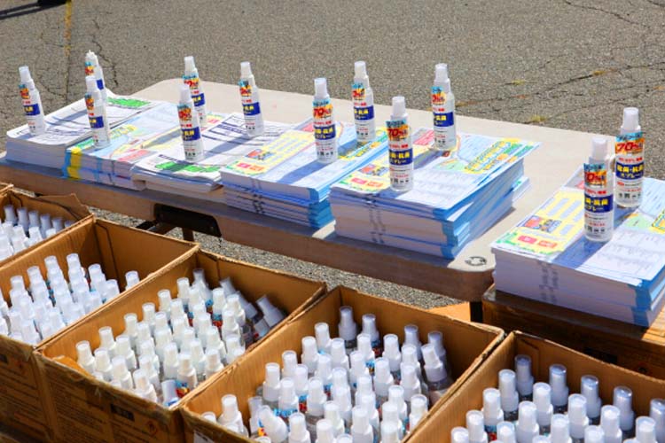 入口には限定3,000個の記念品をご用意。その先には、除菌・抗菌スプレーもプレゼントとして置いてあります。ゲストのユーチューバー こつぶさん、せんちゃんさん、2りんかんキーパーガールの奥沙織さんが記念品を手に笑顔でお出迎えをしました。
