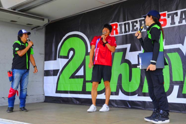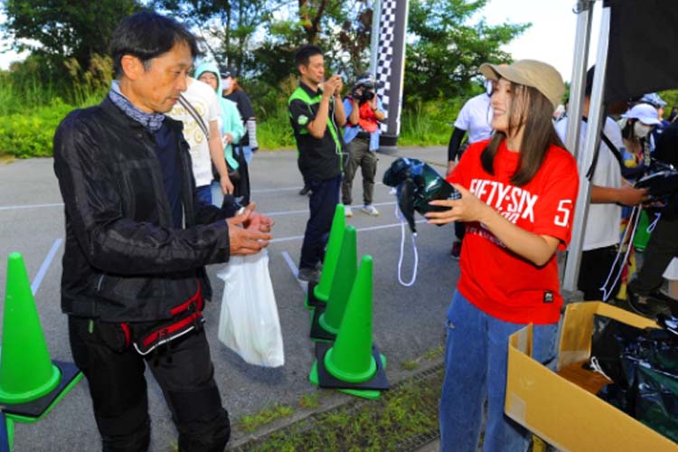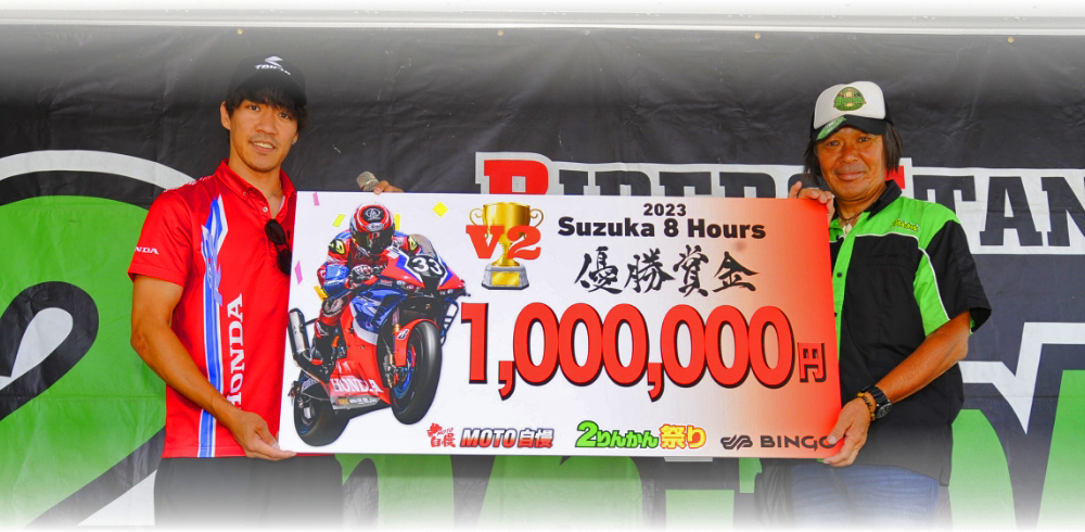 また、長島選手と言えば『MOTO自慢』のアンバサダーでもあります。レース車両はもちろん、公道を走るバイクも大好き。そちらの話でも大いに盛り上がり、レースもツーリングも大好きなライダー達は熱心に聞き入っていました。また、鈴鹿8耐の優勝を成し遂げた功績を称え、『MOTO自慢』『BINGO』『2りんかん祭り』から賞金100万円を贈呈。2りんかん石渡社長が代表してパネルを手渡しました。