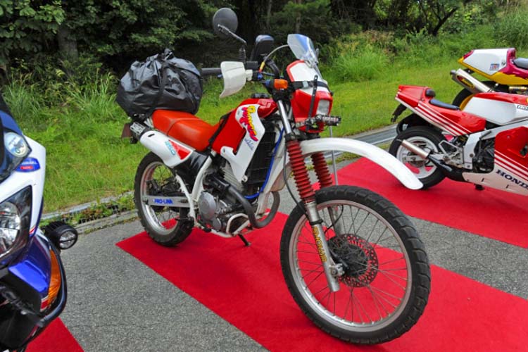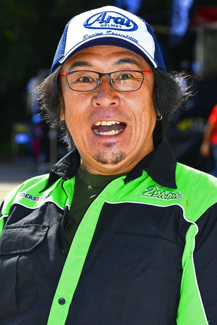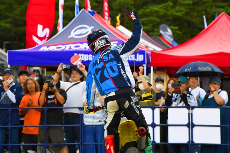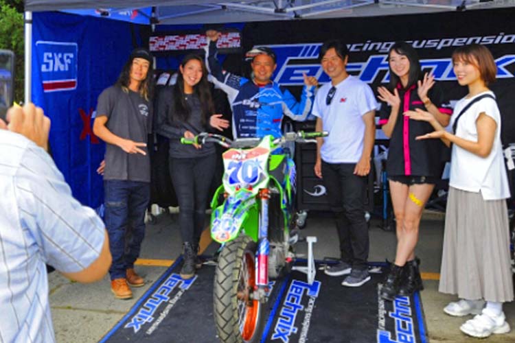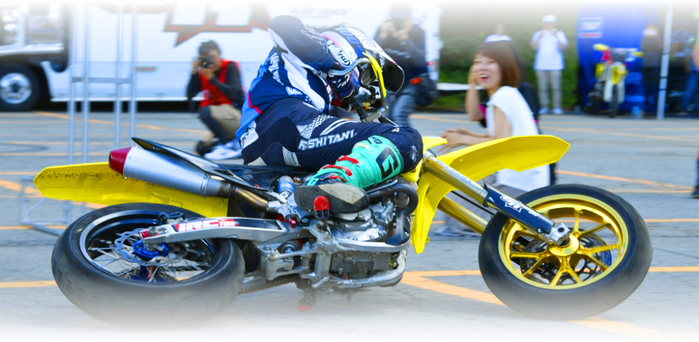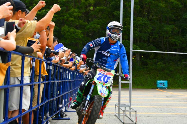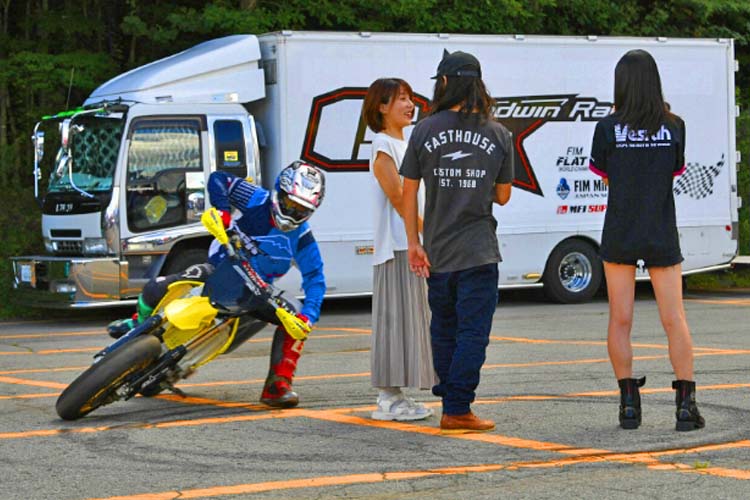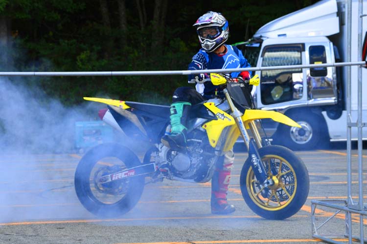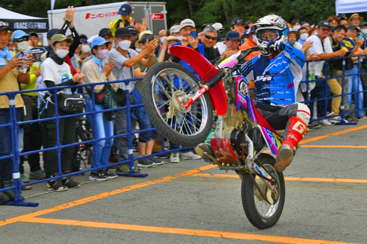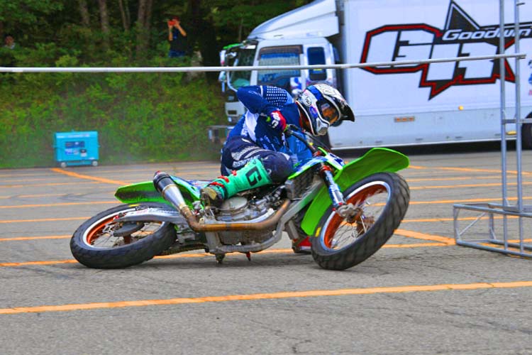 今回は競技車両の他に、ご自身で開催しているスクールで使用するXR100が登場。小さい排気量ながらもしっかり迫力あるスライド走行を披露します。このスライドコントロールの凄さは、元MotoGPライダーの中野真矢さん、モトクロスライダーでもある風間晋之介さんも感心するほど。バイクリンボーは恐ろしいほど盛り上がります。写真や動画で見てもわかりますが、「我々の感覚ではすでに転倒してますよ」と末飛登さんが叫ぶほどでした。