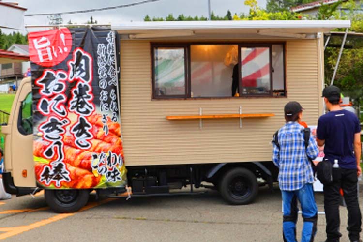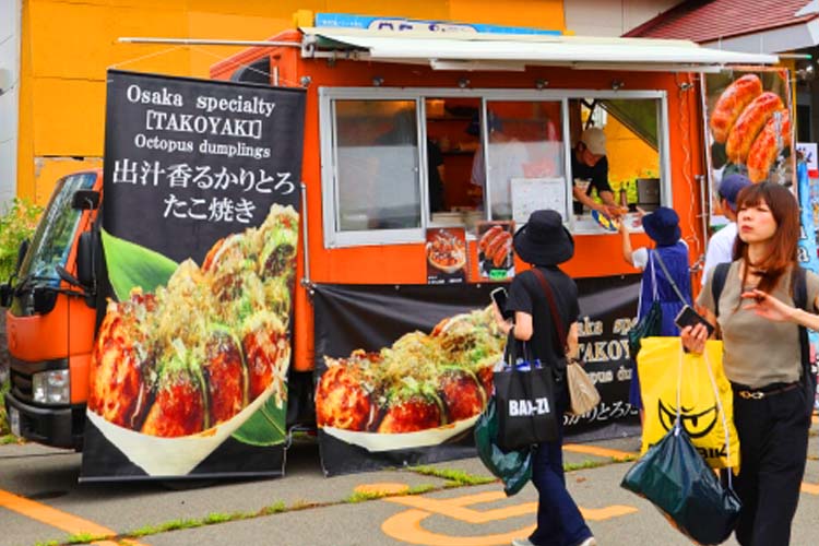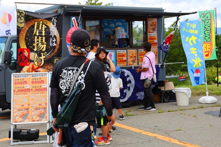 2りんかん祭りはお昼をまたぐイベントですから、当然のようにお腹が空きます。そこでフードトラックがたくさん集結しました! ミスト付きの扇風機も準備して、休んでいただくこともできます。ただし、お昼頃はやはり混むので、「朝ごはんを抜いて、到着してすぐ食べました」(参加者)という頭脳派の方も。
