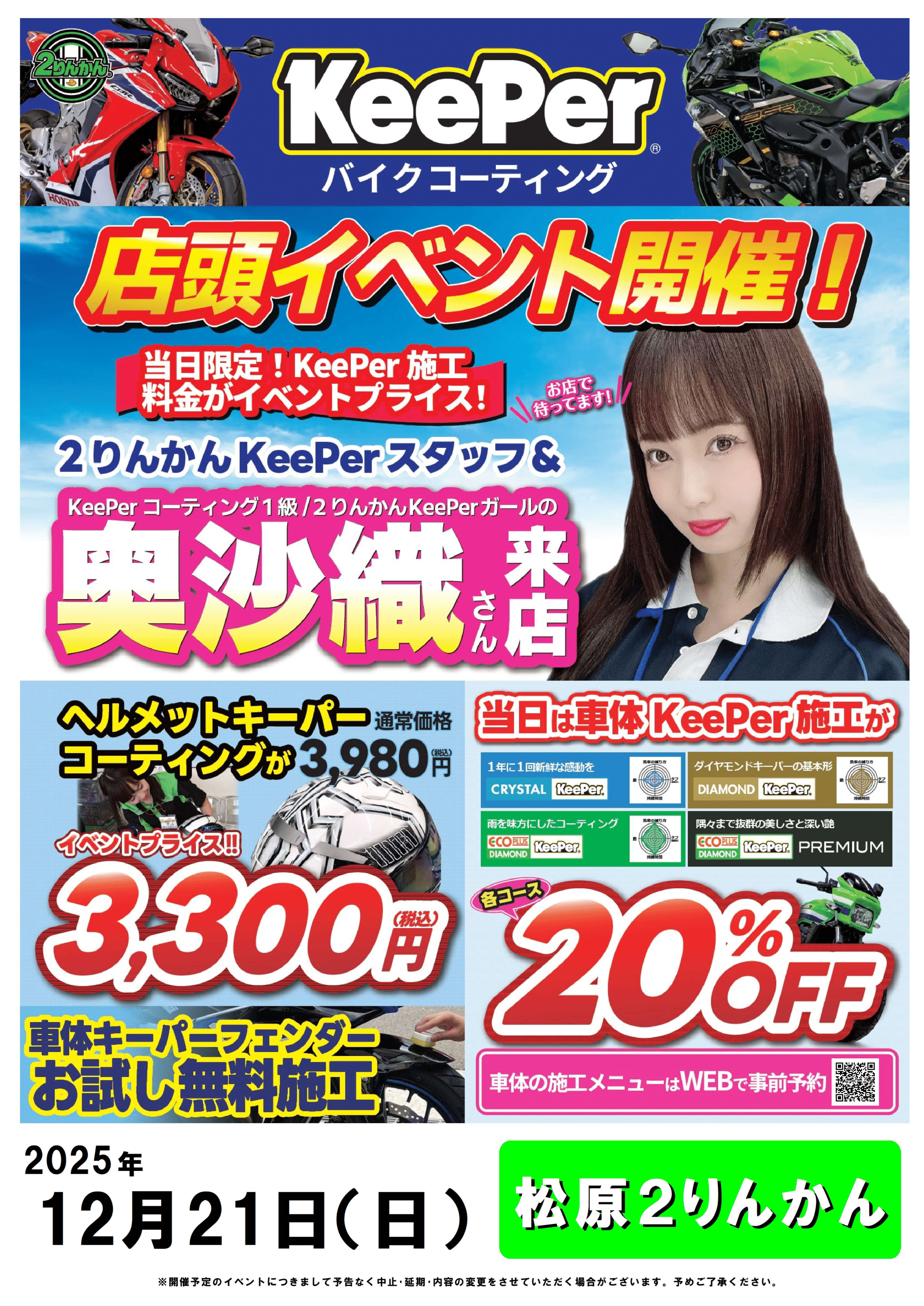 12月13日(土曜日)はKeePerイベントです。 車体KeePerの施工が通常価格の20%OFFと大変お得です。 事前予約をしておけば当KeePerのプロ集団が施工致します。 ヘルメットコーティングは通常3,980円が […]