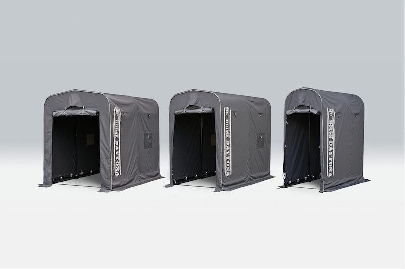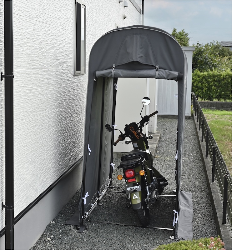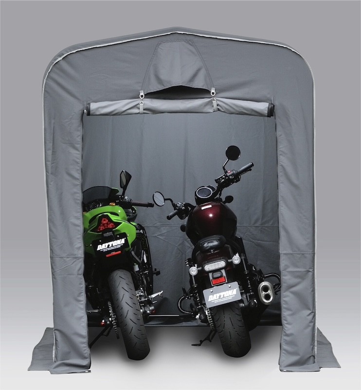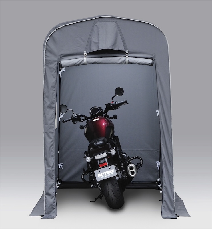 バイクカバーだと被せたり捲ったりが毎回面倒。取り外したカバーの収納場所にも頭を悩ませます。とは言え、バイクガレージほど大袈裟な物はちょっと‥予算も限られているし‥‥。そんなあなたにデイトナから新しい選択肢のご提案。