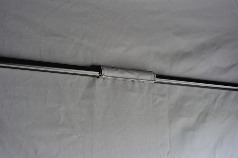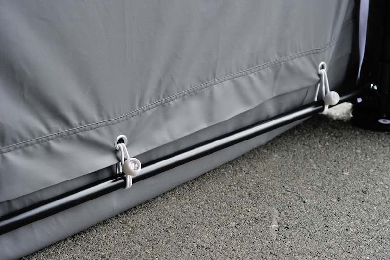 幌は室内4か所の面ファスナーと裾部分のゴム紐でフレームとしっかり固定。
