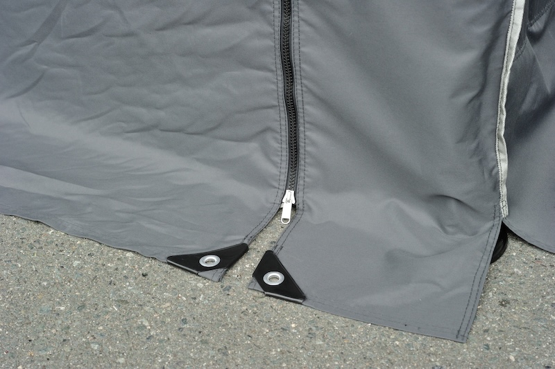 オートバイの保管を考えた湿気対策砂などの侵入を防ぐスカート形状。前後に設けたベンチレーション、地面からパイプを持ち上げたフレーム構造で湿気を逃しやすくしています。スカート形状の裾は、砂やほこりなどの侵入を防ぎます。開閉部は南京錠の使用が可能で防犯面も考慮。
