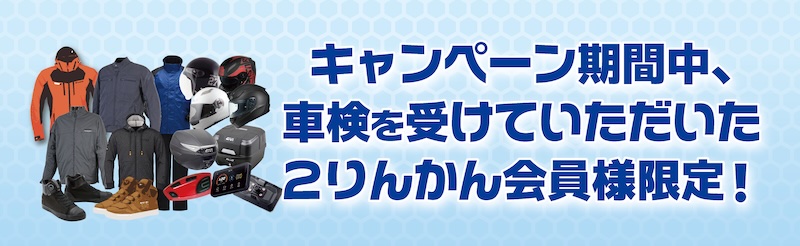 期間中に2りんかん各店舗でバイク車検を受けると、お買い物で使える2りんかんポイントを2,000円分プレゼント!。2りんかん会員に登録されている方限定となりますが、当日入会でも大丈夫です。2りんかんで車検を受けてお得になるチャンスです!