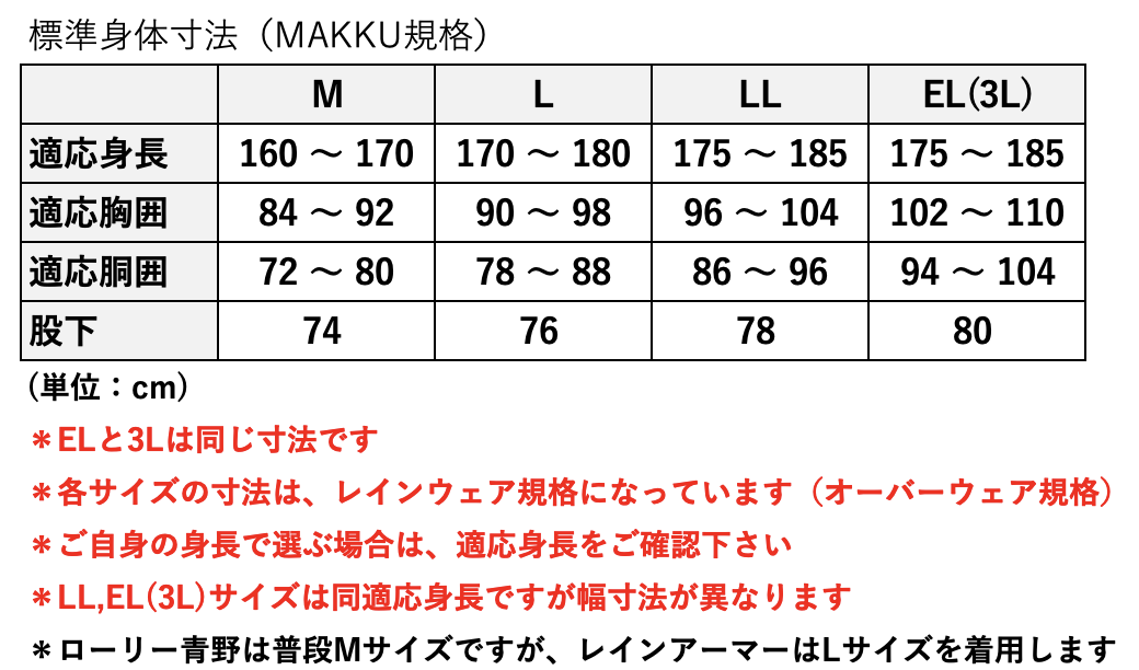 ご自身の身長、体型に適合するサイズをお選び下さい