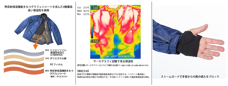 表地、中綿、PEフィルム、熱反射保温機能をもつグラフェンシートの4層構造で高い保温性を実現し、手首はストームガード装備で風の侵入をシャットアウト。真冬のツーリングシーンで活躍するウィンタージャケットです。