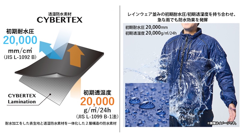 生地にCYBERTEXを採用することで、レインウェア並み(初期耐水圧20,000mm、初期透湿度20,000g/m2/24h)の初期耐水圧/初期透湿度を持ち合わせ、急な雨でも防水効果を発揮します。