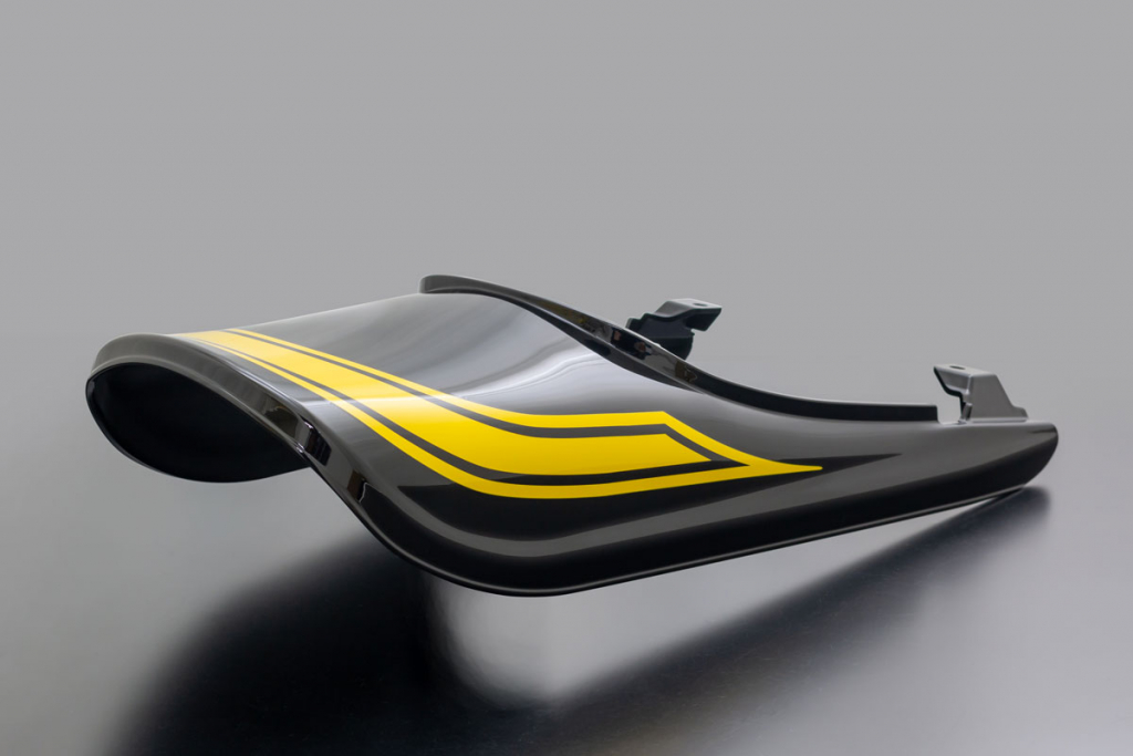 後部から見るとよく分かるが、純正テールカウルにはラインが入っていない。純正をベースにしたドレスアップを志向するのであれば、あえて無地のテールカウルを選択するというのも正解の一つと言えます。