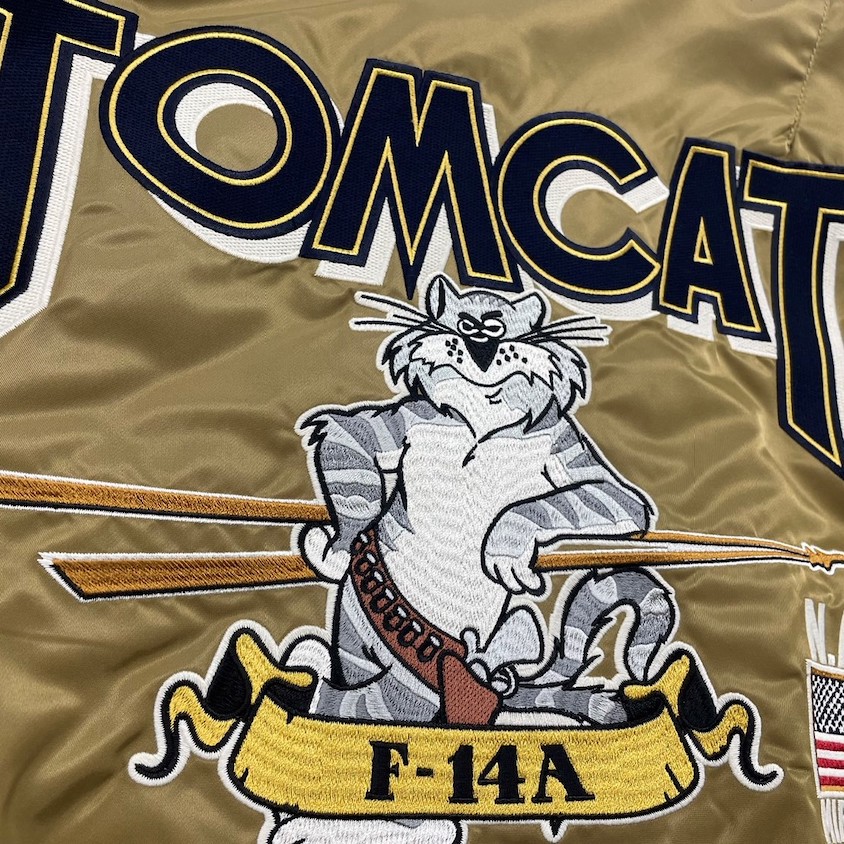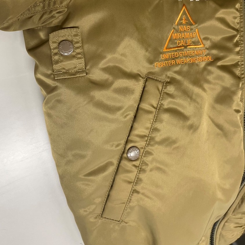 AVIREX定番のヘビーナイロンツイルを使用したMA-1。フラップのない腰ポケットとICSコードループ、表地と同系色の裏地使いが特徴的な初期型のディティールを採用し、中綿には保温性の高いTHERMOLITEを使用した機能的なアイテム。 U.S. NAVY FIGHTER WEAPONS SCHOOL、通称TOPGUNと、F-14A戦闘機通称TOMCATをモチーフとした刺繍を施し、AVIREXらしいミリタリースタイルに仕上げている。