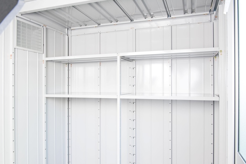 ガレージのサイズ毎に最適な段数の棚が付属します。見た目以上に充分な耐荷重値があるので、ツールチェストやオイルのペール缶を積んでもへっちゃらです。