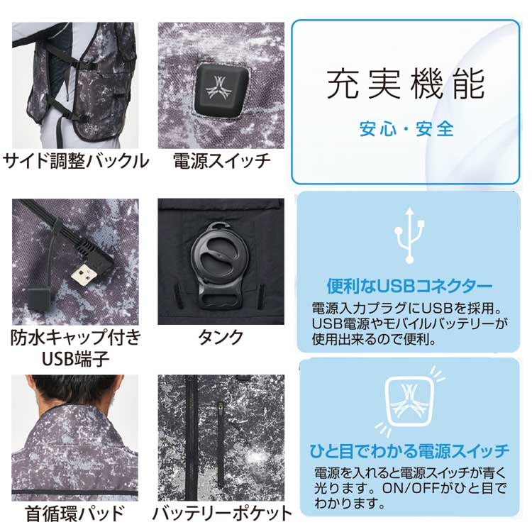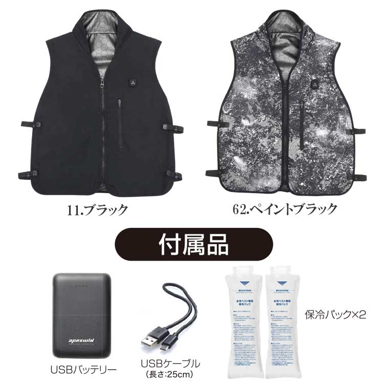 スイッチ一つで簡単操作なのに瞬時に身体を冷やす優れもの!カラーはブラックとペイントブラックの2色。バッテリー・ケーブル・保冷剤のフルセットで即使用可能!