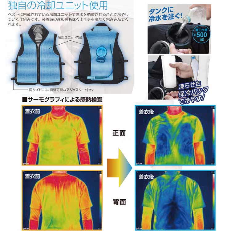 ベスト内蔵の冷却ユニットで冷水を循環させることにより、上半身を冷たく包み込んでくれます。サーモグラフィにも注目!