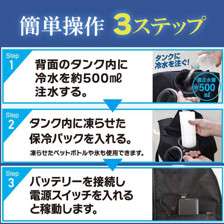 ①タンク内に冷水を約500㎖入れる。 ②タンク内へ凍らせた保冷材も入れる。 ③バッテリーを接続し、電源スイッチを入れる。