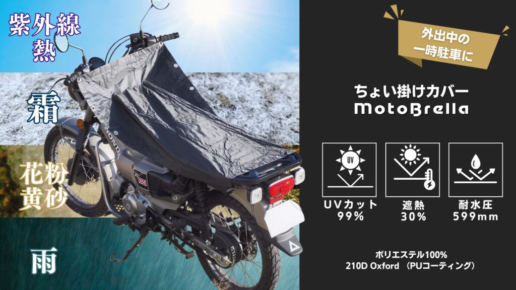 外出先の一時駐車でシートの熱さに悩むライダーに!|バイク用ちょい掛けカバー MotoBrella(モトブレラ)