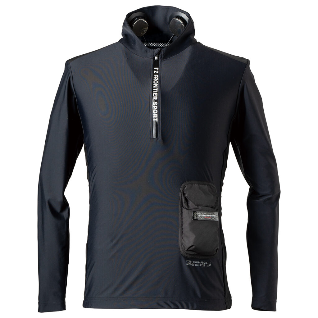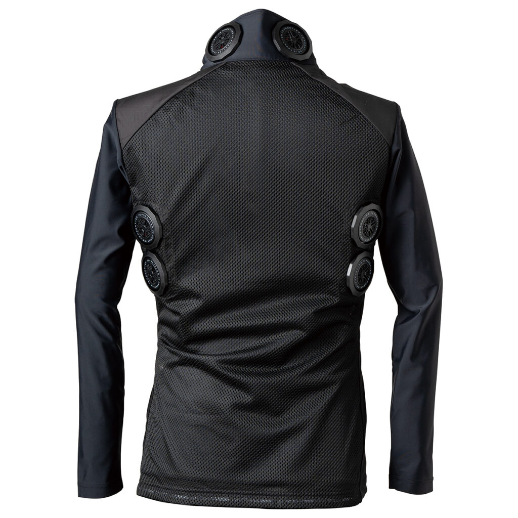 上記のペルチェデバイスが装着可能になインナーウェアで、後ろ衿と背面両脇の計6箇所に配置されるようになっております。後ろ衿では直接首元を、背面両脇は太い血管が通っている脇下付近を冷却するようになっており、効率的に身体を冷却する設計となっております。ウェアに使用している素材も伸縮性に非常に優れており、また業界最高レベルの接触冷感性を誇る高機能素材になっているため、唯一無二のさわやかな着心地を実現します。