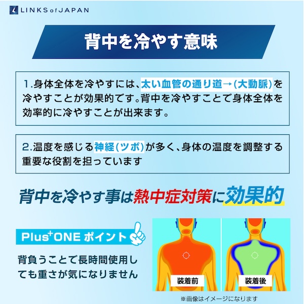 背中の太い血管周辺をピンポイントで冷却。熱を効率的に逃し、まるで身体のラジエーターのように深部体温を下げます。
