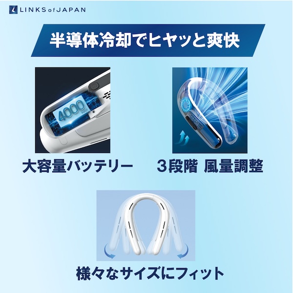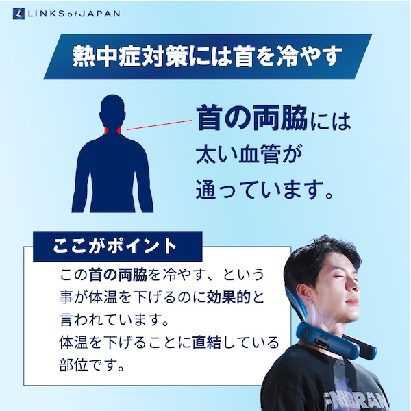 首元にある太い血管を冷やすことで、全身に涼しさが広がる仕組み。首にかけるだけの軽量・コードレス設計で、手軽さと効果を両立。