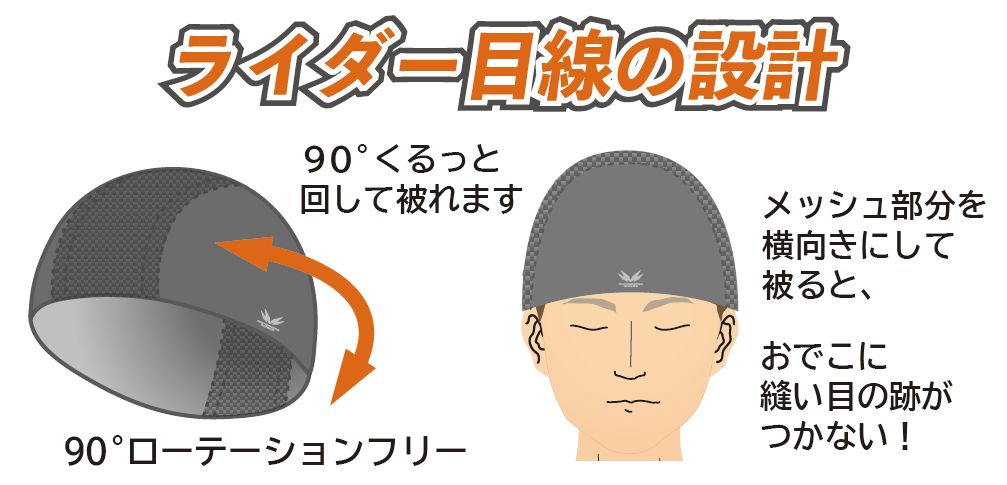 下端は縫い目の無いシームレス。さらに90度回してもかぶれるので脱いだ時におでこに縫い目のあとがつきにくい構造です。開発担当がライダーであればこその気配りです。