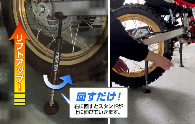 サイドスタンドの反対側に設置することで強風にも耐えやすくなります。転倒防止としての利用時はタイヤが持ち上がらない程度に、サイドスタンド側へ荷重がかかる程度で設置します。