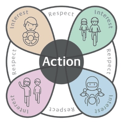 Hondaは、交通社会に参加するすべての方々を加害者にも被害者にもさせないという想いのもと、Hondaグループだけでなく、お客様や地域社会を含むすべての交通参加者が、お互いを「思い」「尊重し合い」「自ら安全行動する」ためのきっかけを作ることを目指しています 。