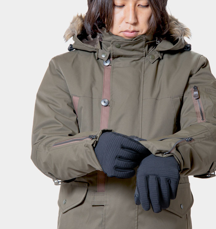 軽さと、手にすっと馴染むやわらかさ。操作性を追求した設計で、グリップ操作もスマートに。中綿入りのソフトシェルで防風・撥水性も備えた安心設計。さらに、防水透湿フィルムと衝撃吸収素材〈PORON®XRD®〉を搭載し、突然の雨や衝撃からもしっかりガード。スマートフォン操作やグリップヒーターにも対応しています。