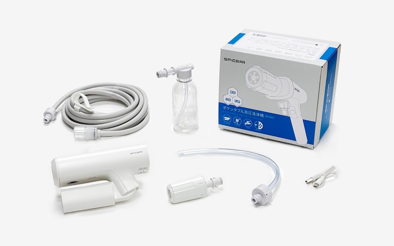 SPICERR「ポケッタブル高圧洗浄機 SWU-201」は、約800gと軽量でポケットに入るサイズ。水栓不要で、ペットボトル装着またはホース装着の2通りの方法で洗浄できるため、自宅だけでなく、キャンプや海、お墓参りなど水場が近くにない場所でも持ち運んで使えます。
