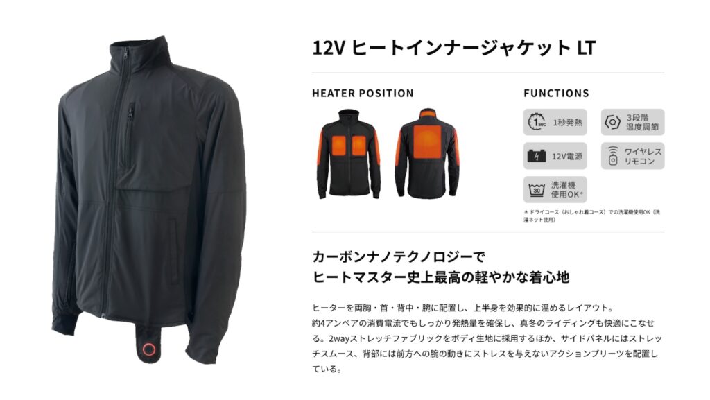 カーボンナノテクノロジーでヒートマスター史上最高の軽やかな着心地!12V ヒートインナージャケット LT