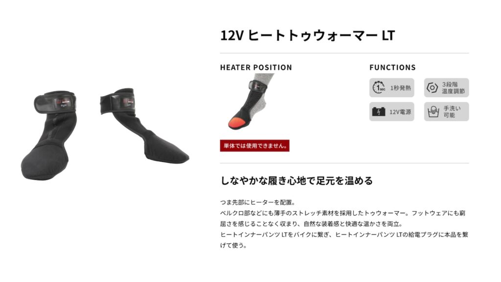 しなやかな履き心地で足元を温める!12V ヒートトゥウォーマー LT