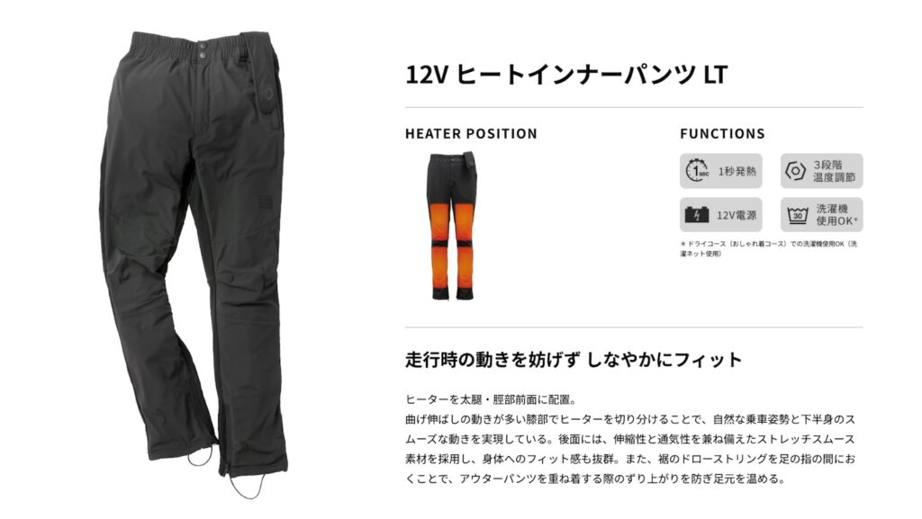 走行時の動きを妨げず しなやかにフィット!12V ヒートインナーパンツ LT