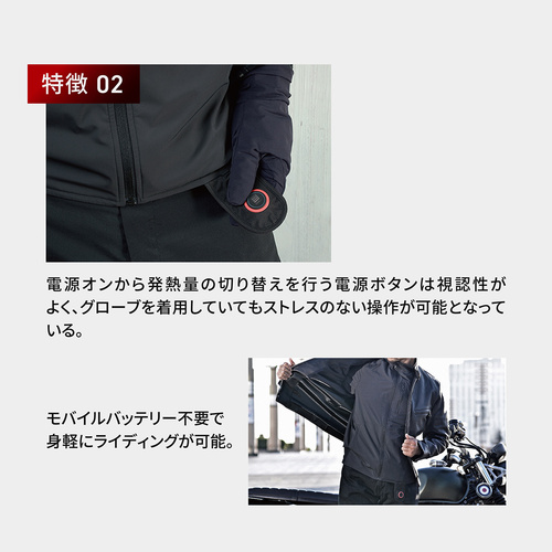 先端のカーボンナノチューブフィルムヒーターを胸、背部、腕部と上半身を効果的に暖めるレイアウトにしたヒートインナージャケットLTは、約5アンペアの消費電流でもしっかり発熱量を確保し、真冬のライディングも快適にこなせる1枚。2wayストレッチファブリックをボディ生地に採用するほか、サイドパネルにはストレッチスムース、背面にはアクションプリーツをあしらうことで、電熱線の存在を感じさせないカーボンナノチューブフィルムヒーターの恩恵を最大限に活かした着心地をぜひ体感してください。