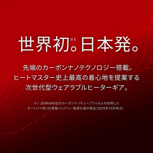 「世界初。日本発」 1秒発熱。より軽く、より薄く、より柔らかく、脅威の耐久性。先端のカーボンナノテクノロジーでヒートマスター史上最高の着心地を提案する、最新型 次世代ウエアラブルヒーターギアです。