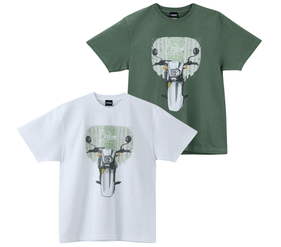 「初代SEROW225」と「ファイナルエディション250」を並べて描きおろしたデザイン。Tシャツ カラー:ホワイト、シティグリーン