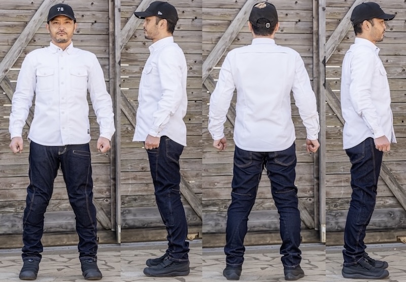 このシン・ライダーデニムは、見た目は通常のジーンズですがバイク乗車に特化されています。ライディング時の快適性を追求し【ヨコ伸び】だけでなく【タテ伸び】する日本製マルチストレッチデニムを搭載しています。ストレッチ性は【タテ118%】【ヨコ122%】とタテヨコ圧倒的なストレッチ性を有しています。ウエストも伸びるので着用感はジャージを穿いてると錯覚する程の動きやすさと軽さで非常にストレスなくラクになっています。