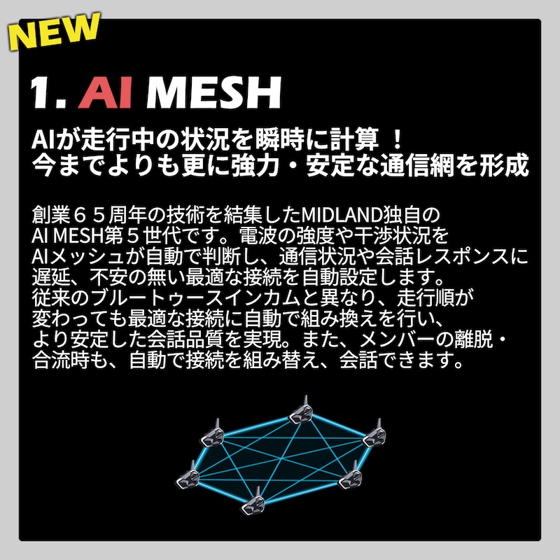R1 MESHには、走行中の通信状況をAIが分析し、最適な接続状態を維持する AI MESH を搭載。