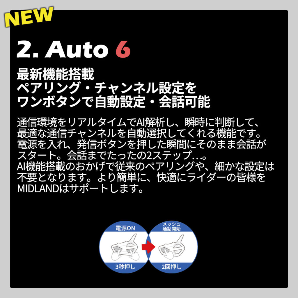 さらに、最大6人のグループ通話をスムーズに管理する Auto 6 により、集合時はワンボタンで会話をスタート。走行中にはぐれてしまっても、残ったメンバー同士の通話はそのまま継続し、戻ってきたライダーは圏内復帰と同時に自動で会話に合流できます。