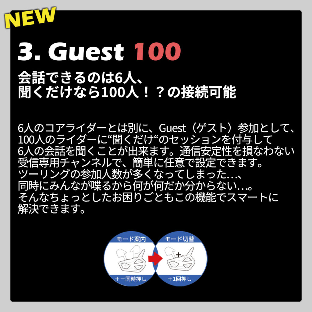 6人のコア通話メンバーとは別に、圏内のライダーが“聴くだけ参加”することも可能。大人数ツーリングやイベント走行でも、その便利さを実感いただけます。