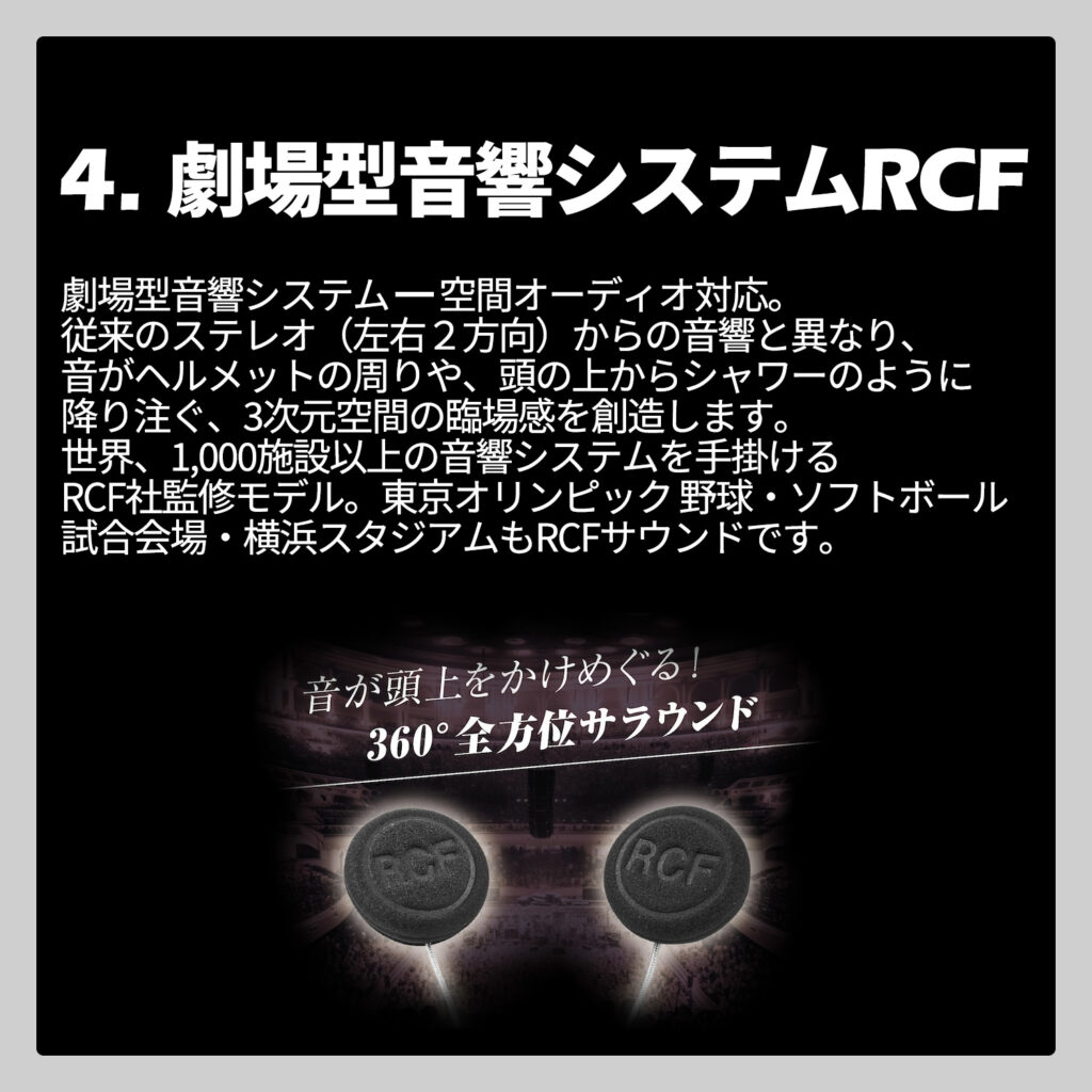 音質面でも妥協はありません。イタリアの音響システムメーカーRCF社と共同開発した「RCFプレミアム サウンド スピーカー」を搭載し、ヘルメット内で立体音響を楽しめます。オートバイ用インカムとしてはMIDLANDだけのスペシャルな音響をご体感頂けます。