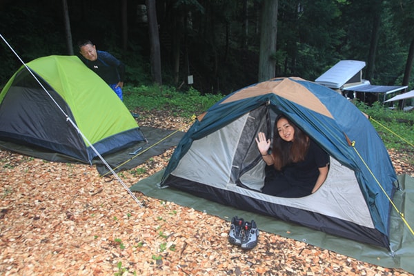 優香ちゃんは初めてテントをたてるので、説明書を見ながら格闘していきます。青柳さんはというと、雨に備えて先に食事会場のタープを設置します。撮影班がお手伝いしたので写真レスですが…。