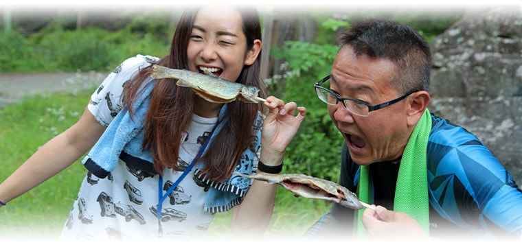 渓流釣りをするのは、ベリーパークフィッシュオン。ニジマスなどを狙うので、ルアーやフライといった釣り方もできます。今回は優香ちゃんがルアー、青柳さんが覚えたてのフライでフィッシング。優香ちゃんのマネージャーさんが釣りも好きだということで、一式を借りて指導も受けちゃいます。