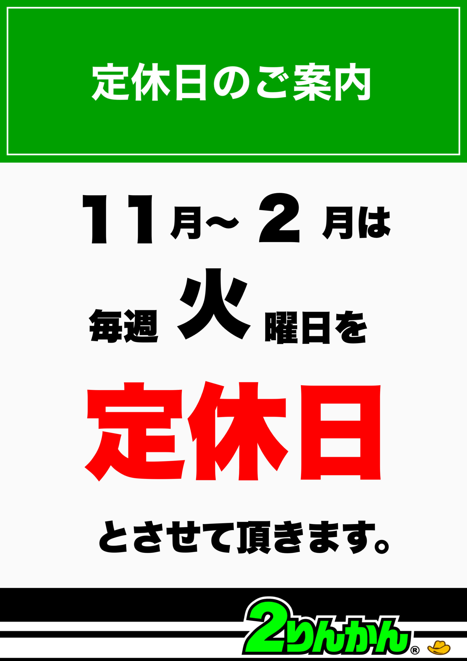 誠に勝手ながら2025年11月から2026年2月までの間、定休日を設けさせていただきます。