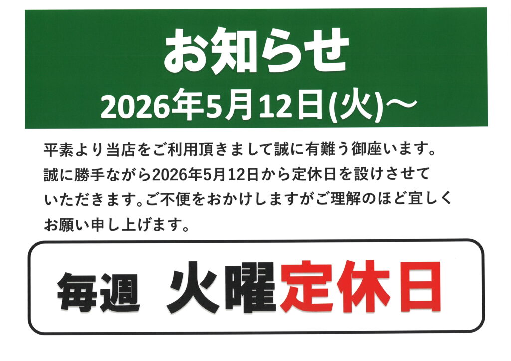 火曜日定休のお知らせ