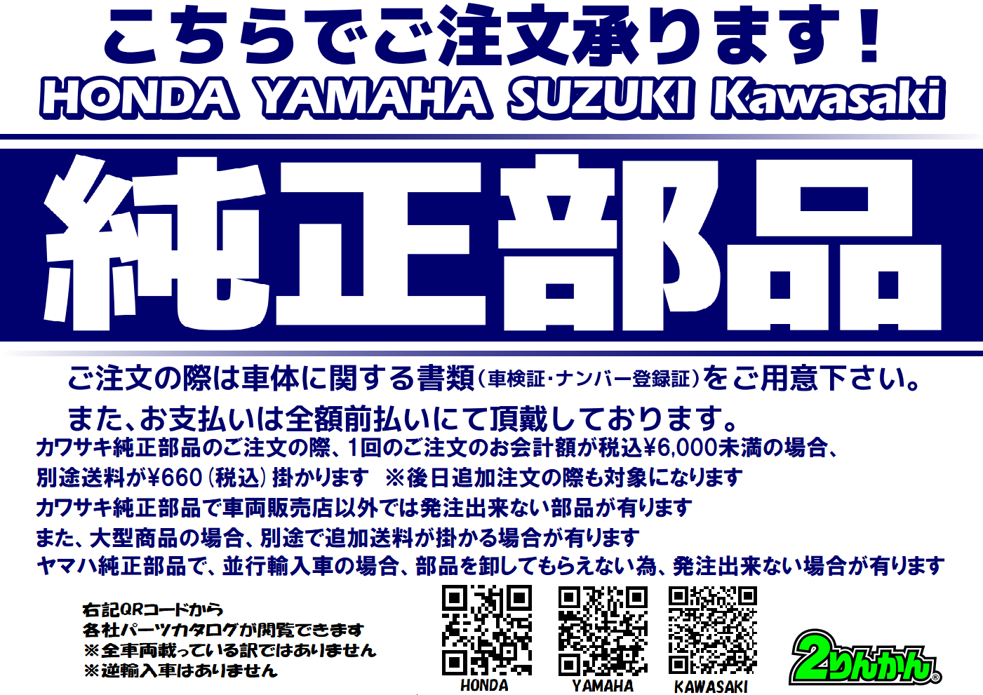 ※正規輸入か並行輸入かメーカーにて調べる為、車体番号(フレームナンバー)が必ず必要となります(部品番号での発注でも必要です)