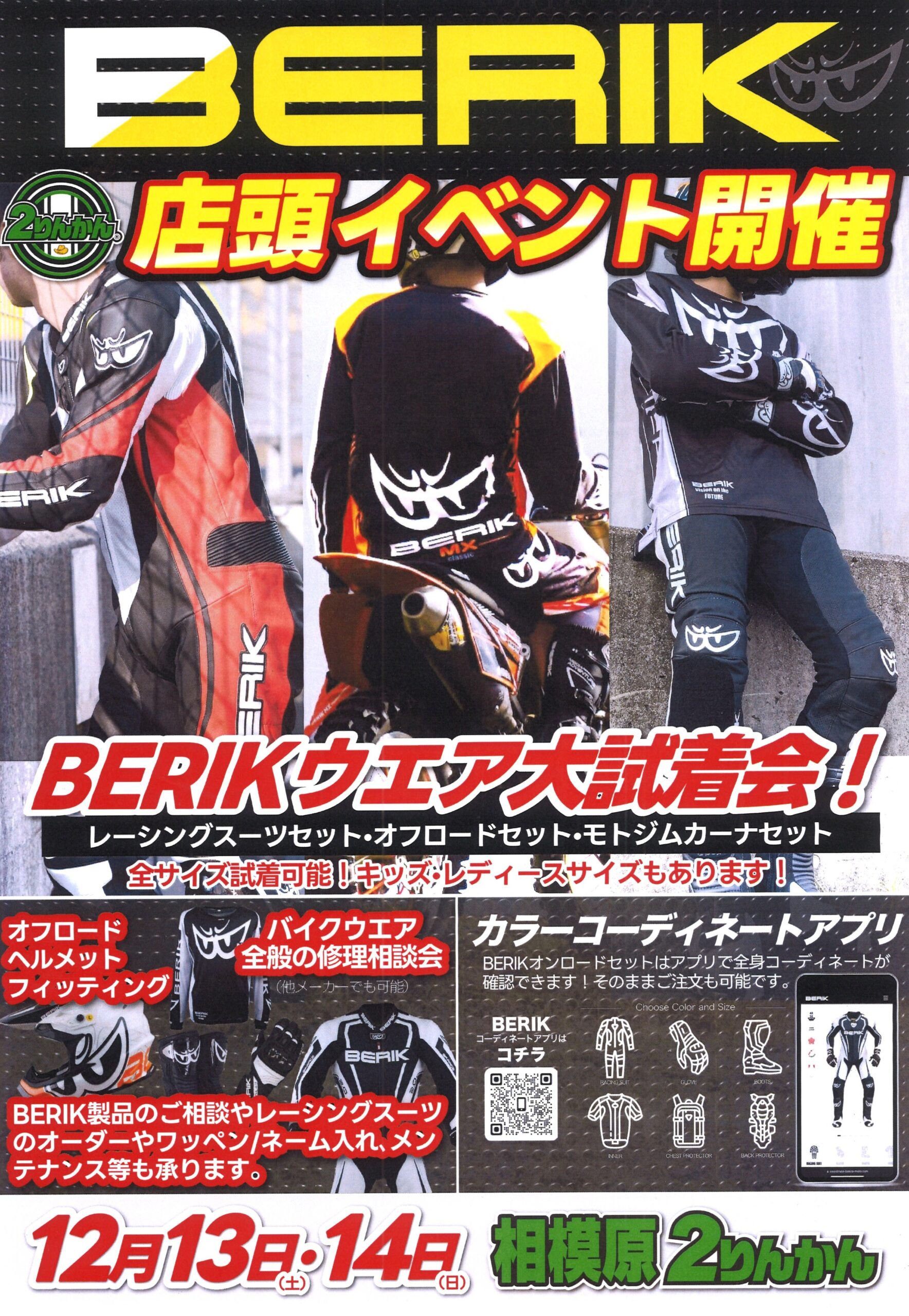 毎回大好評の【BERIK(ベリック)】出張イベントが、12月13日(土)・14日(日)の2日間、相模原2りんかんにて開催されます!