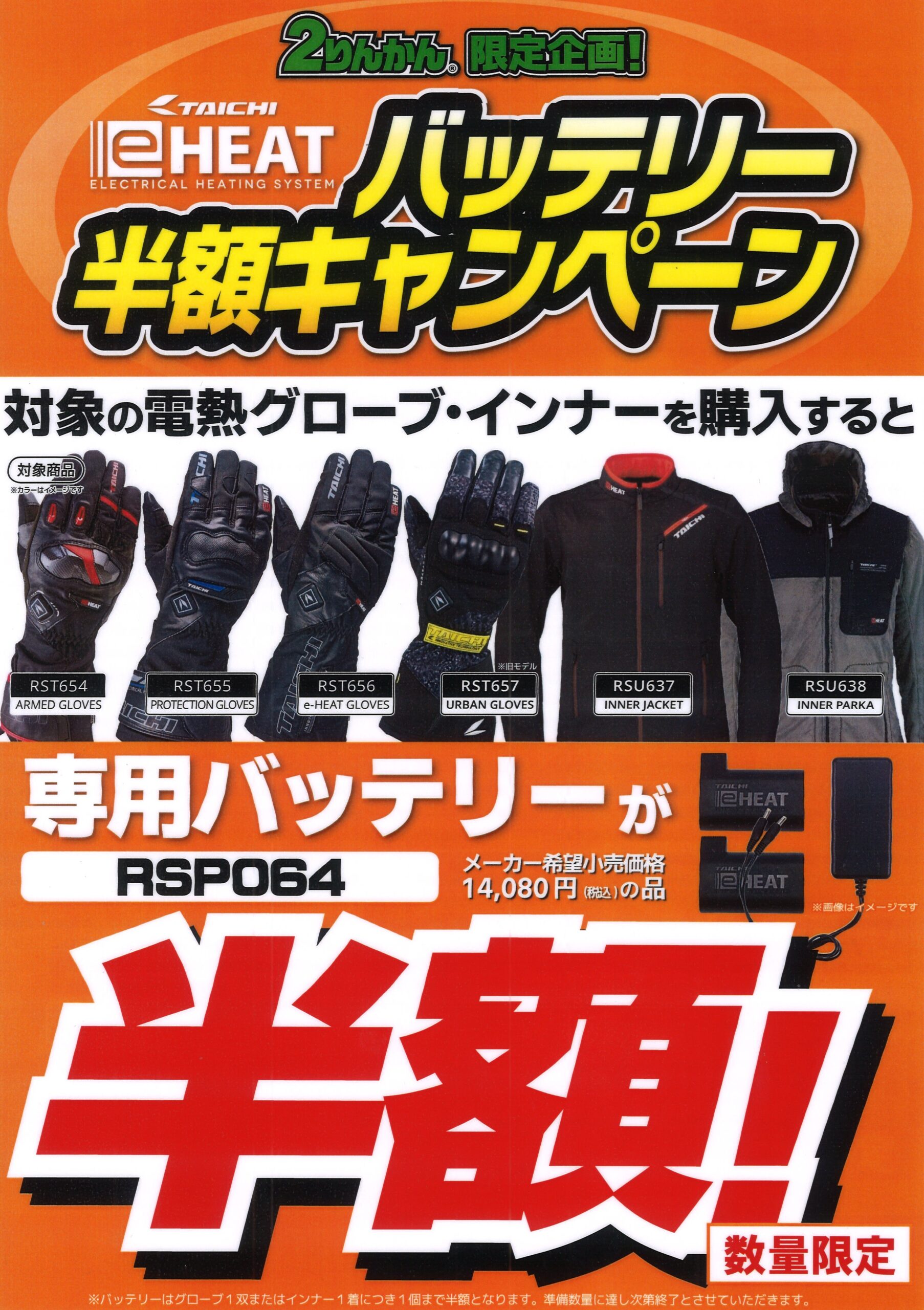 冬の定番・大人気のTAICHI e-HEAT(電熱)シリーズにて、とってもお得な 専用バッテリー半額キャンペーン を開催中!