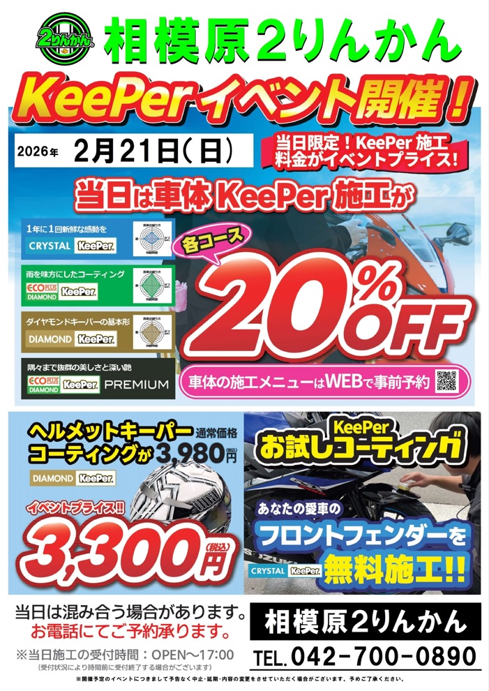 2/21(日)当日は車体keeper施工が、各コース20%OFFになります。