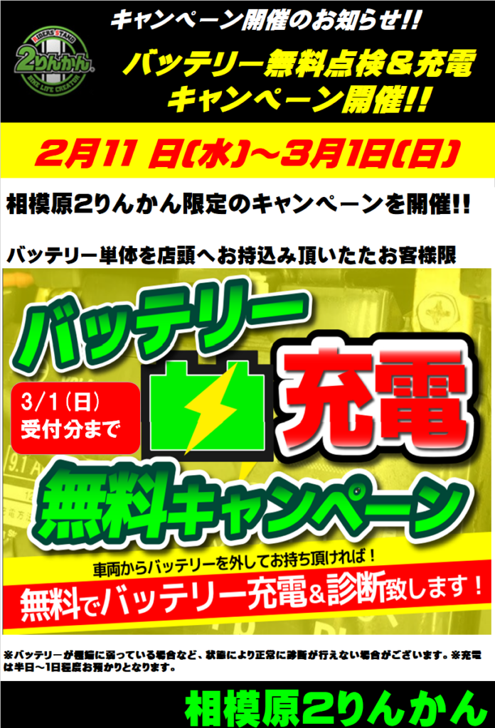3月1日まで!バッテリー充電が無料!電圧診断も無料です!