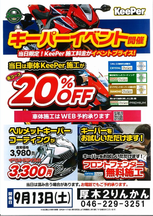 厚木2りんかんでは、12月27日(土)にKeeperコーティングイベントを開催します。
