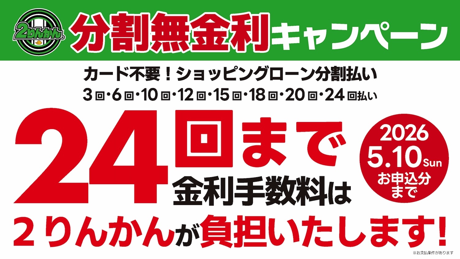 2026年5月10日(日)まで、ショッピングローンの分割金利手数料を全額無料とするキャンペーンを実施中!期間中にショッピングローンをご利用いただいたお客様の分割金利手数料は、2りんかんが全額負担!